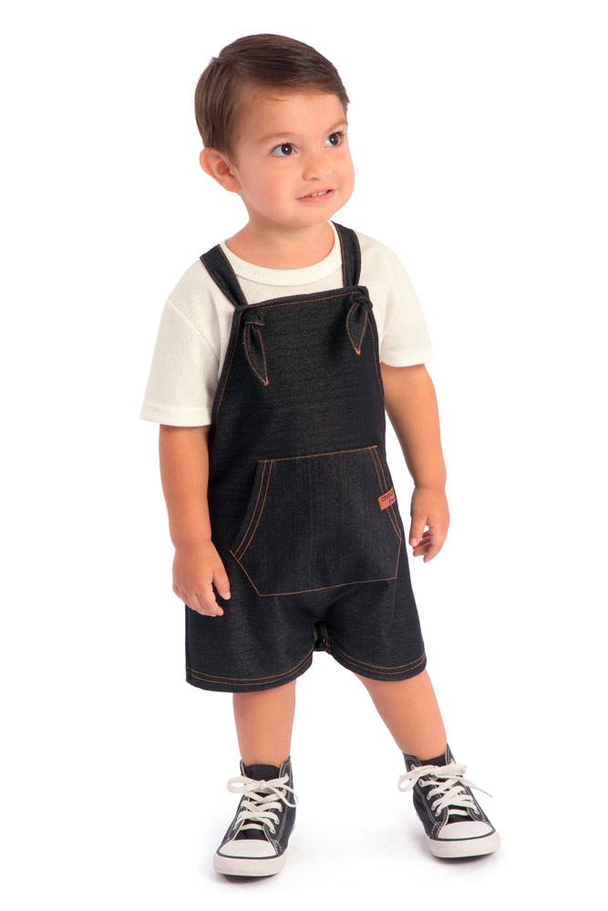 CONJUNTO CAMISETA EM RIBANA TRABALHADA E JARDINEIRA EM COTTON JEANS COM ALÇAS COM NÓ NAS PONTAS, BOLSO CANGURU E ABERTURA COM BOTÕES DE PRESSÃO NO ENTREPERNAS.