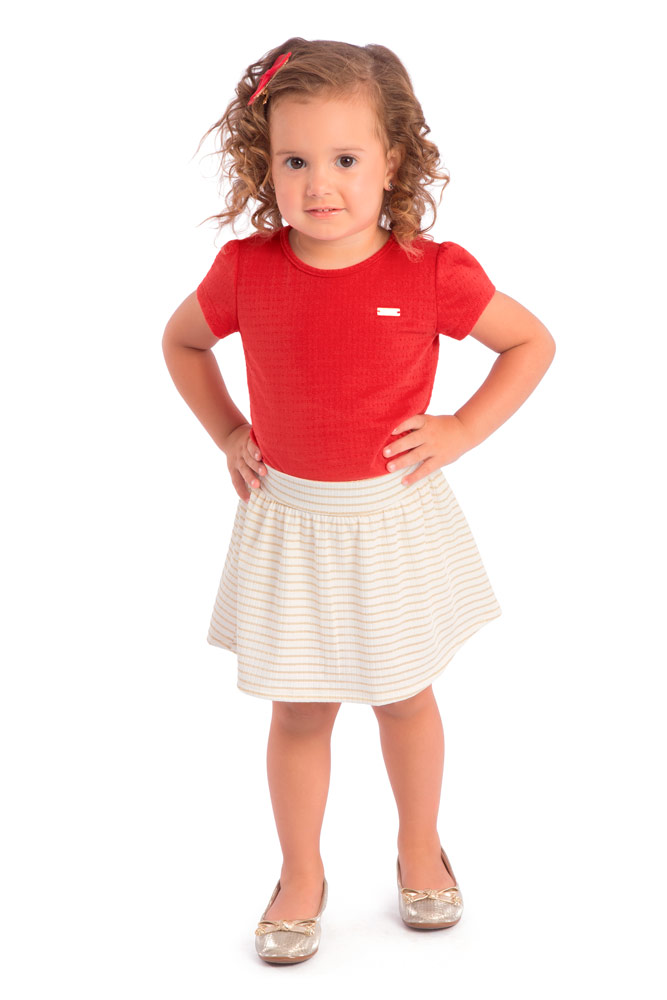 CONJUNTO BLUSA EM MALHA ANA BOLA E SAIA EM RIBANA CANELADA  COM LUREX COM SHORT INTERNO EM  COTTON.